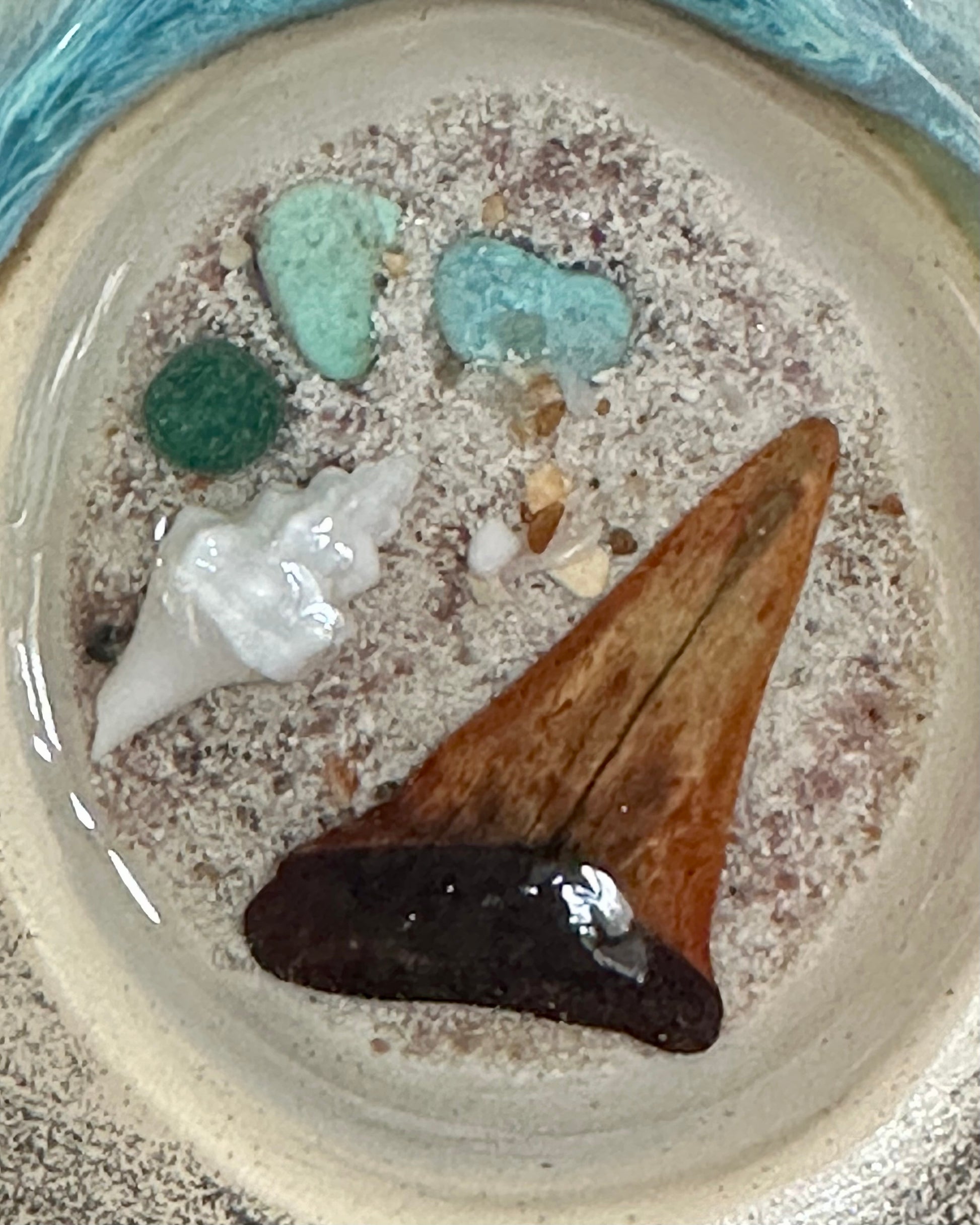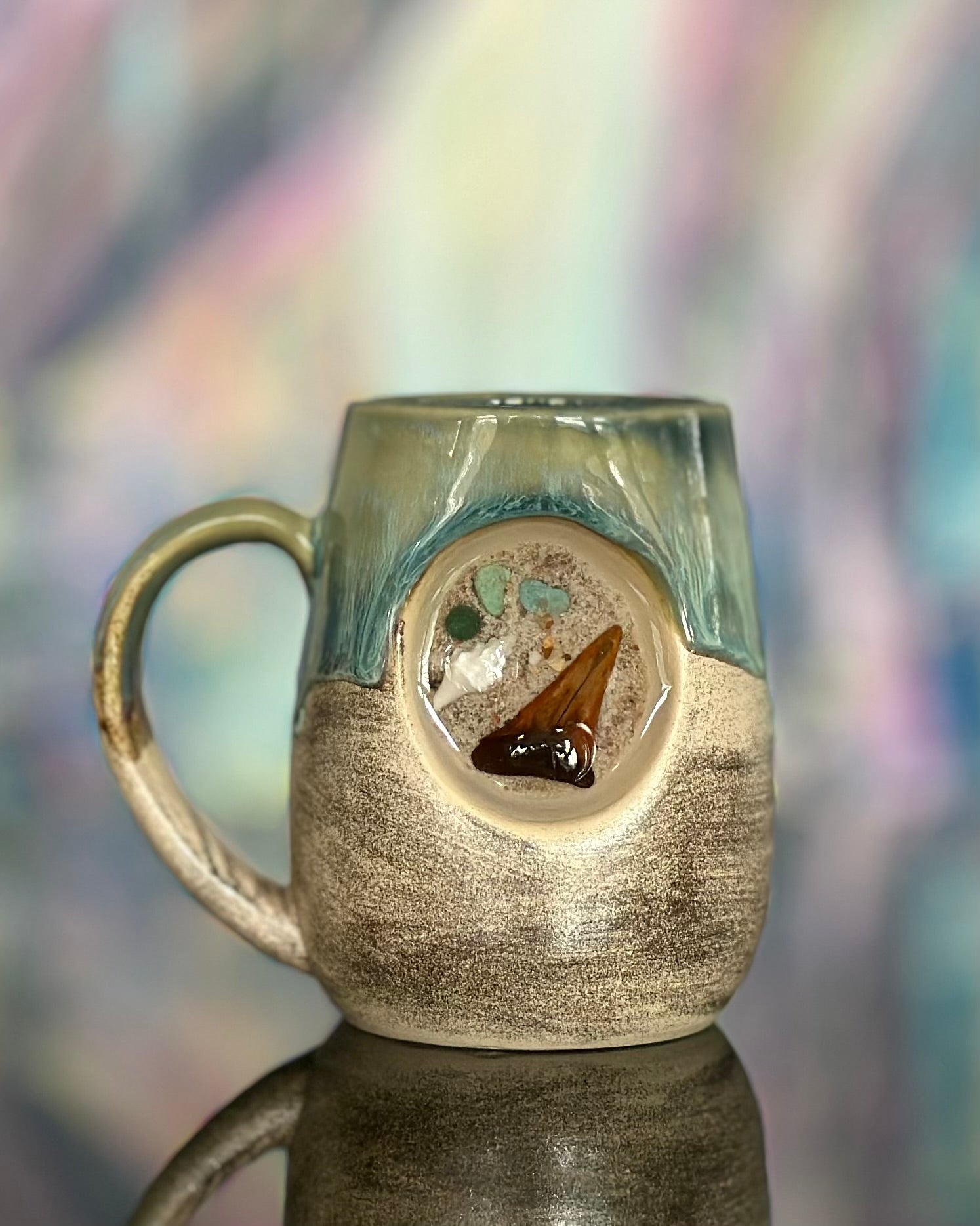 Unleash your inner daredevil with our JAWSOME shark tooth cavern mug! Adorned with an authentic shark tooth fossil, beach treasures, and sand from Turks and Caicos and Topsail Island, each mug is meticulously curated and coated with heat-resistant resin. But remember, to keep your fin-tastic mug in perfect condition, avoid the microwave and dishwasher, and no soaking allowed.